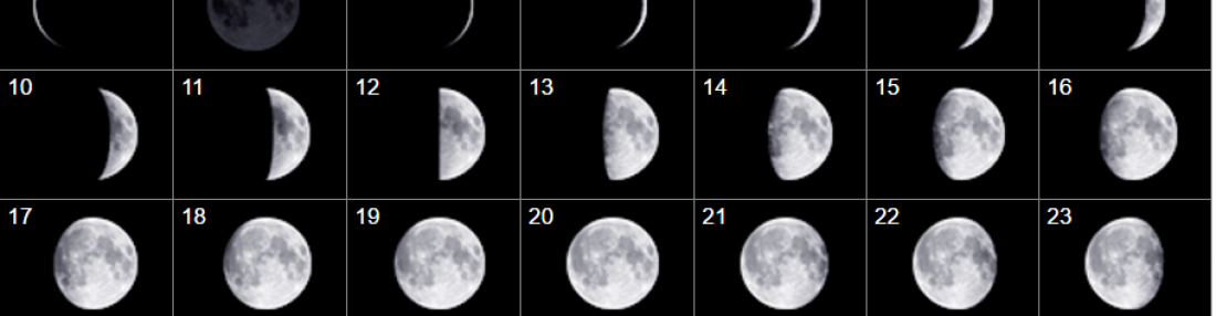 Finally, the moon passes through each astrological sign in about 2.4 days, and each astrological sign is like an ADJECTIVE to the moon. For example a Virgo moon might be highly articulate and discriminatory about … the indefinable; an Aries moon might be assertive about its emotional right-to-be; a Taurus moon is comfortable, at home; a Leo moon prances.